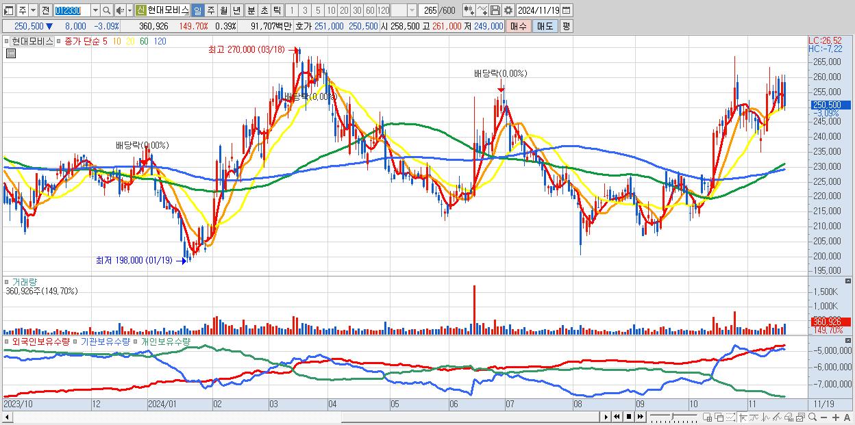 - 현대모비스 (250,500원 ▼ -3.09% , 시총: 232,953억, 외국인 순매수 거래금:78억)