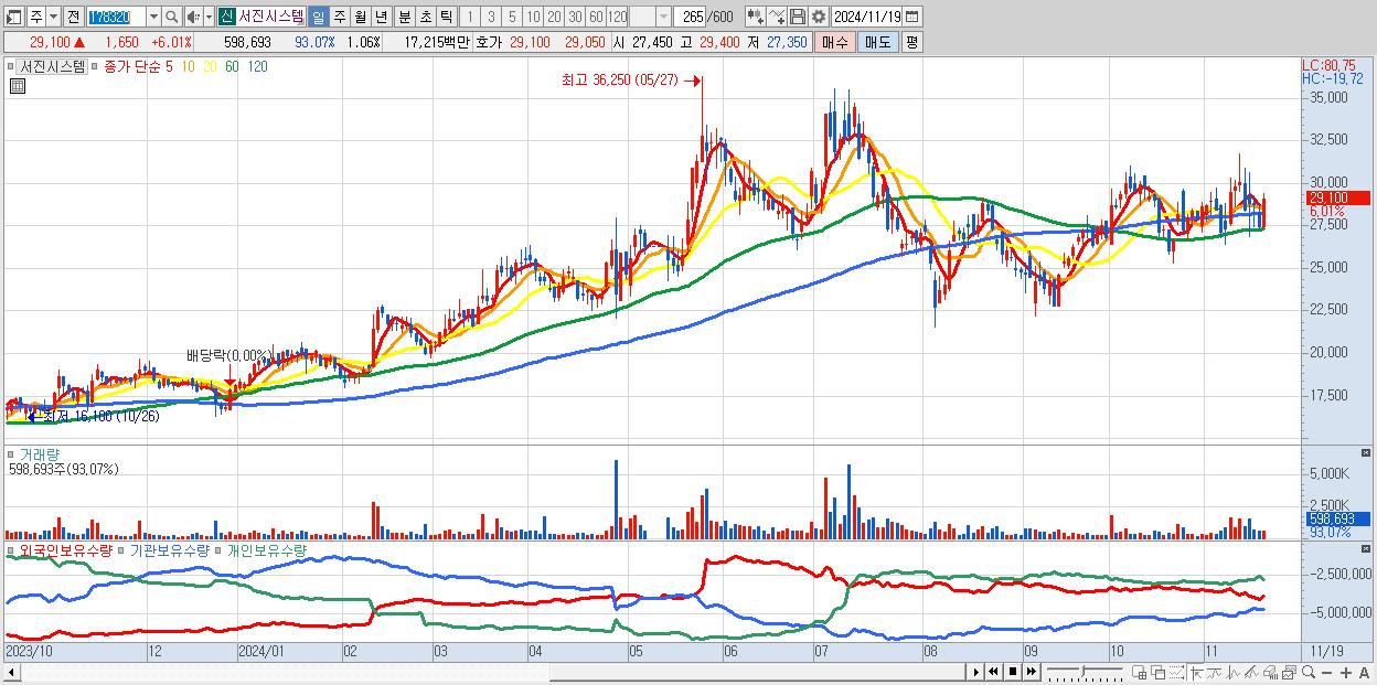 - 서진시스템 (29,100원 ▲ 6.01% , 시총: 16,368억, 외국인 순매수 거래금:53억)