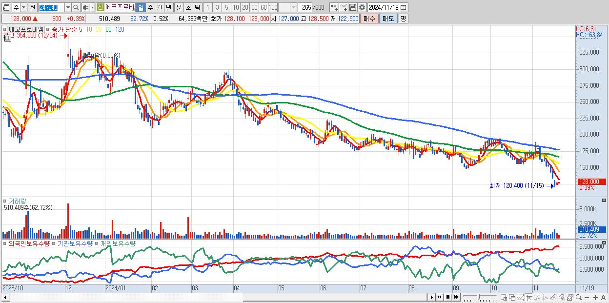 - 에코프로비엠 (128,000원 ▲ 0.39% , 시총: 125,186억, 외국인 순매수 거래금:53억)