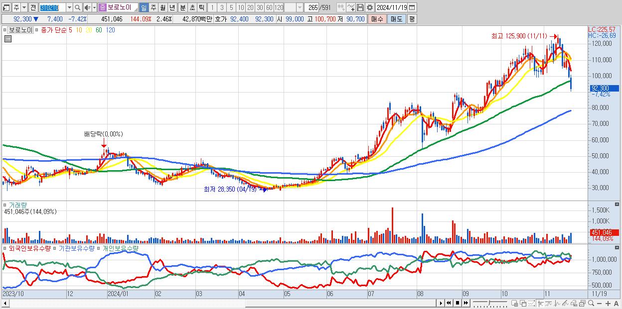 - 보로노이 (92,300원 ▼ -7.42% , 시총: 16,943억, 외국인 순매수 거래금:73억)