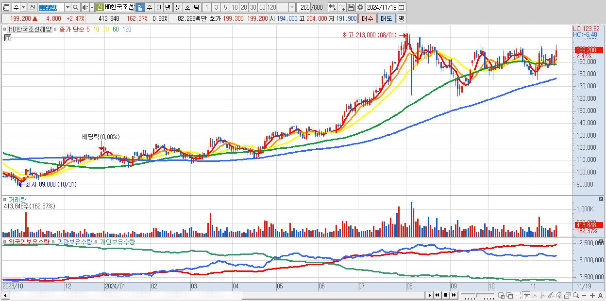 - HD한국조선해양 (199,200원 ▲ 2.47% , 시총: 140,980억, 외국인 순매수 거래금:263억)
