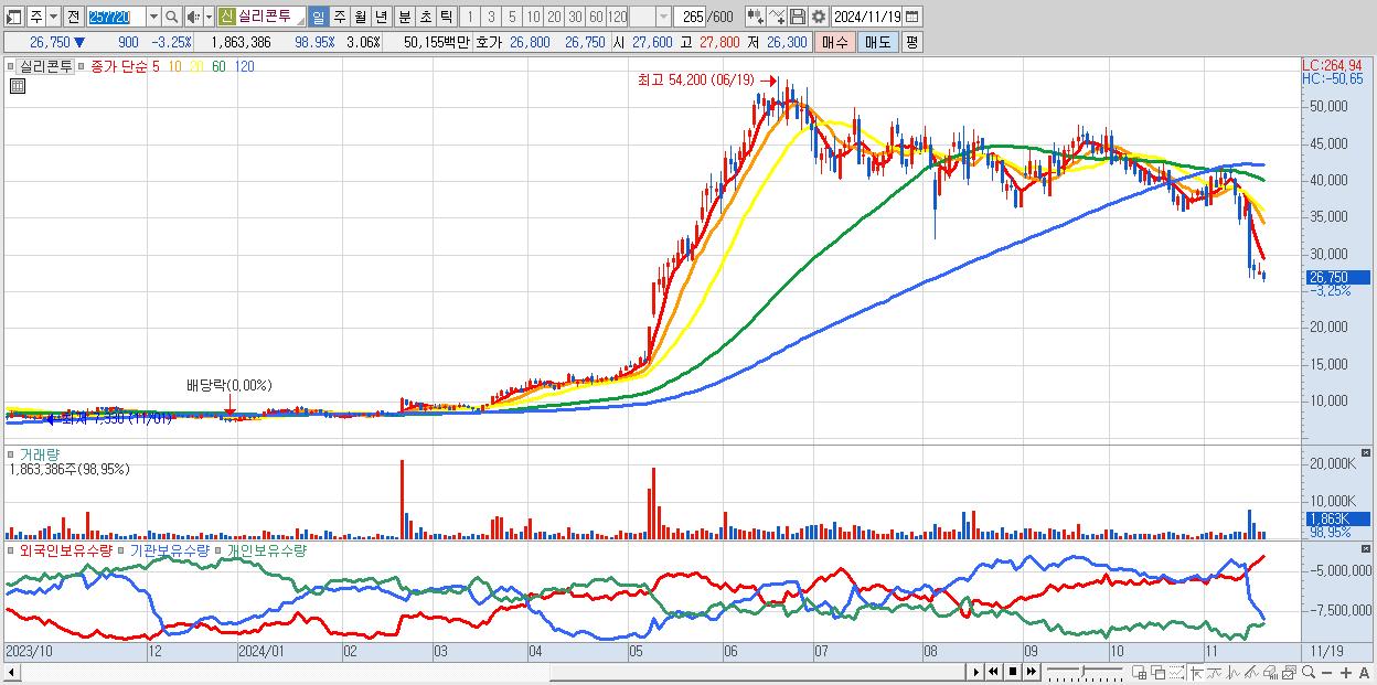 - 실리콘투 (26,750원 ▼ -3.25% , 시총: 16,284억, 외국인 순매수 거래금:63억)
