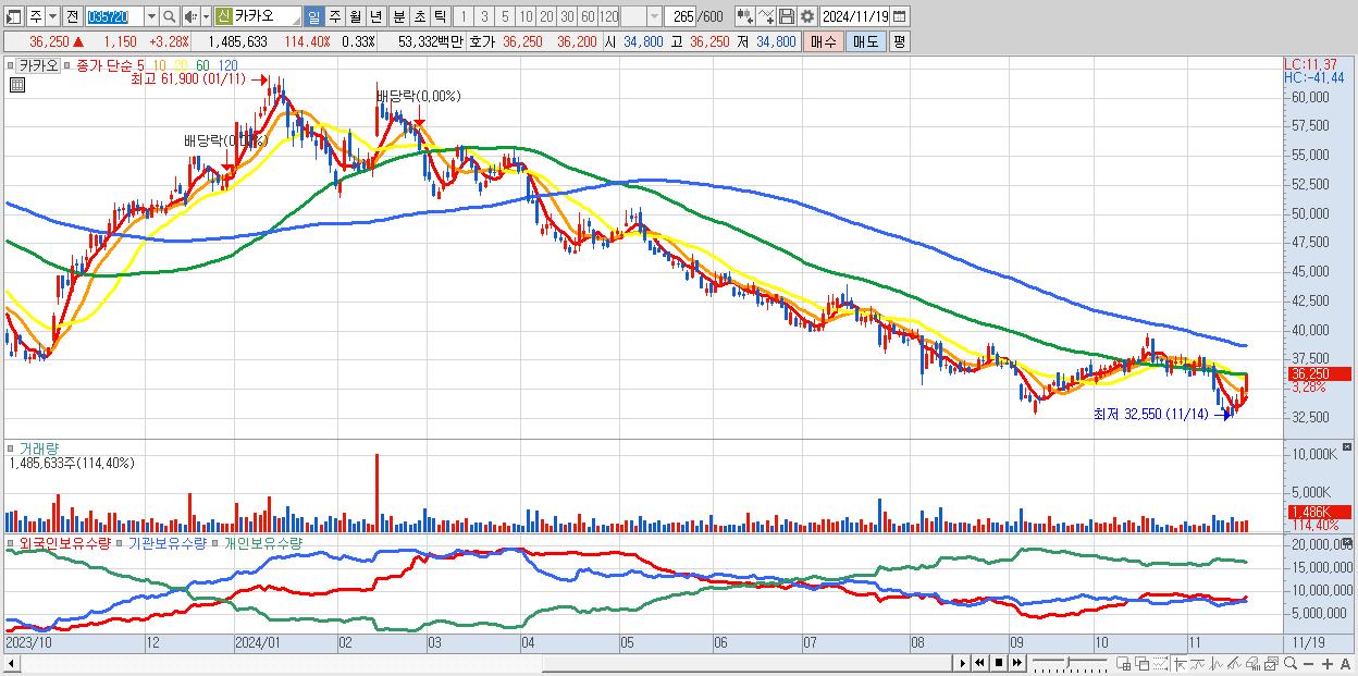 - 카카오 (36,250원 ▲ 3.28% , 시총: 160,788억, 외국인 순매수 거래금:145억)