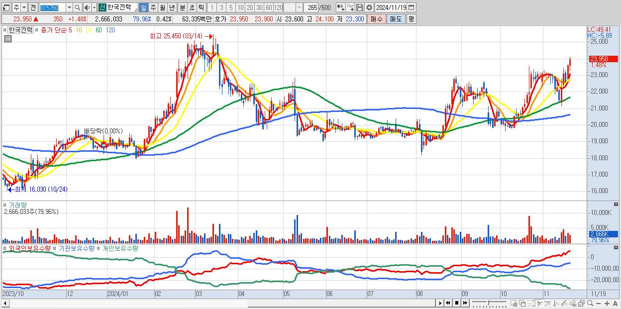 - 한국전력 (23,950원 ▲ 1.48% , 시총: 153,750억, 외국인 순매수 거래금:46억)