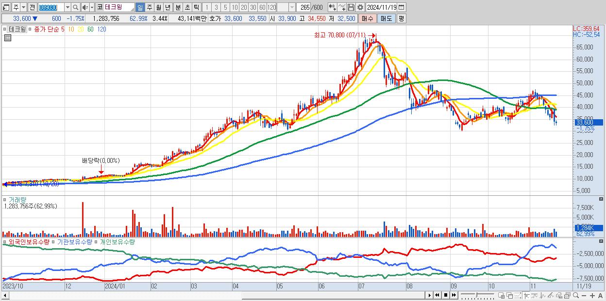 - 테크윙 (33,600원 ▼ -1.75% , 시총: 12,551억, 외국인 순매수 거래금:46억)