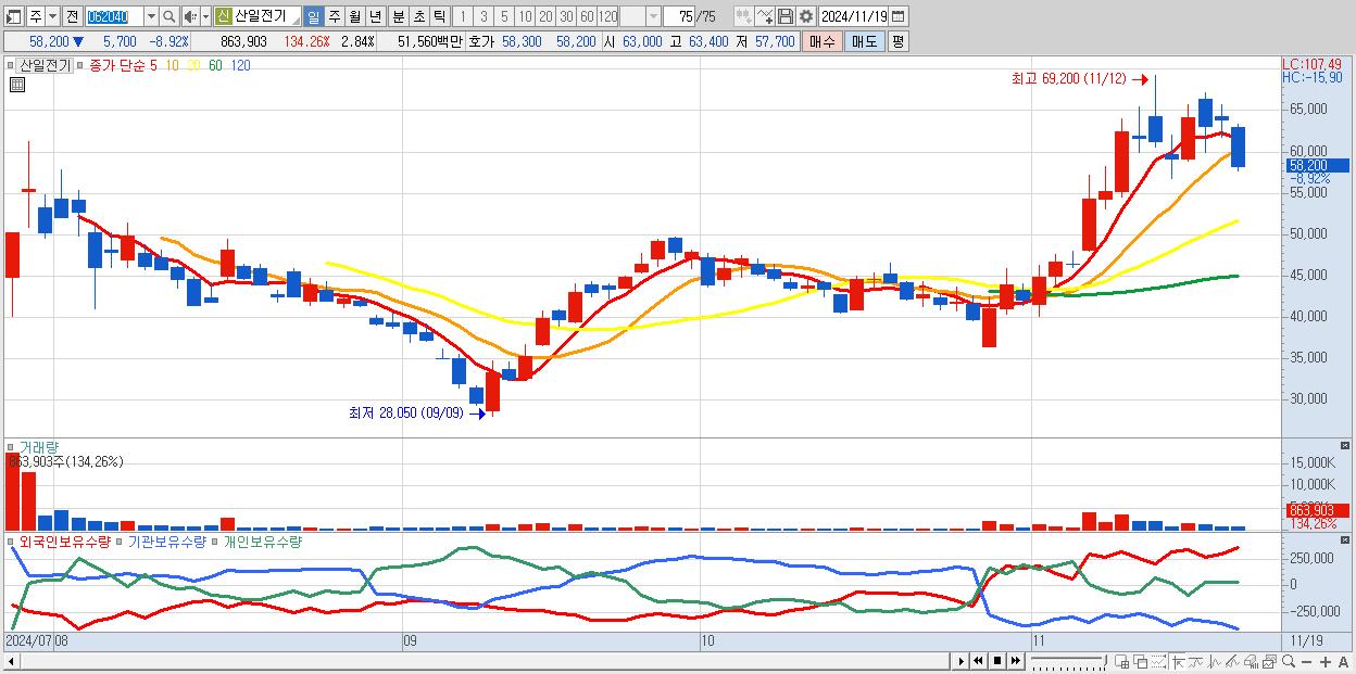- 산일전기 (58,200원 ▼ -8.92% , 시총: 17,719억, 외국인 순매수 거래금:44억)