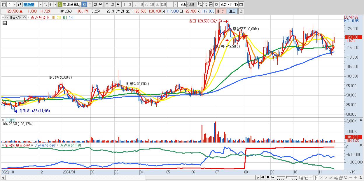 - 현대글로비스 (120,500원 ▲ 1.52% , 시총: 90,375억, 외국인 순매수 거래금:45억)