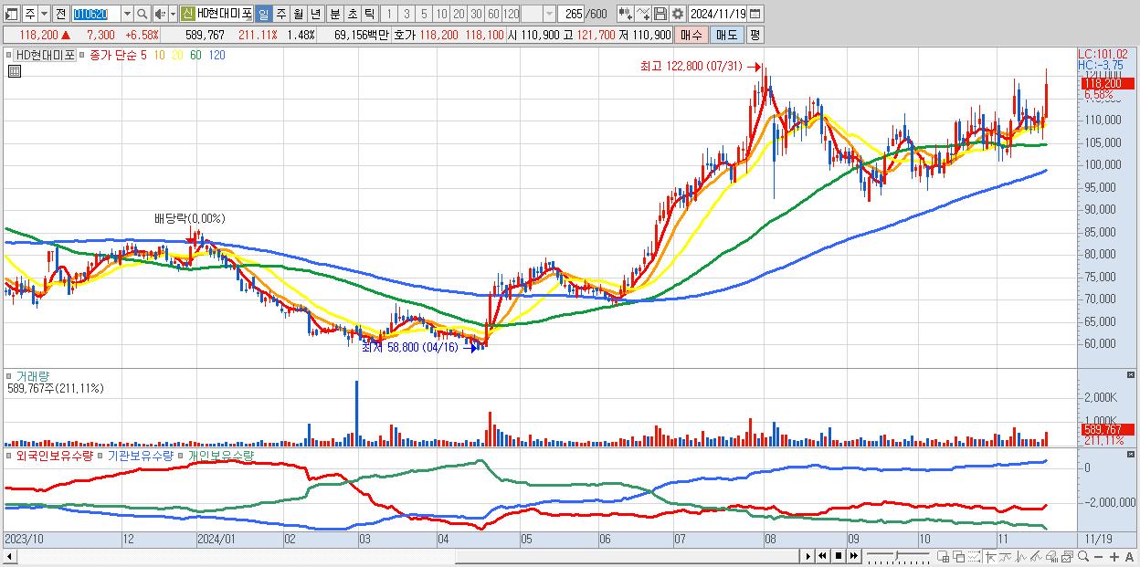 - HD현대미포 (118,200원 ▲ 6.58% , 시총: 47,212억, 외국인 순매수 거래금:134억)