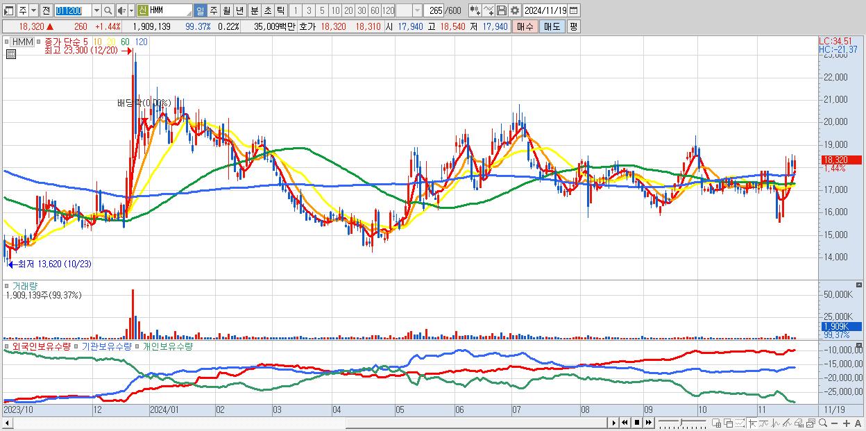 - HMM (18,320원 ▲ 1.44% , 시총: 161,406억, 외국인 순매수 거래금:60억)