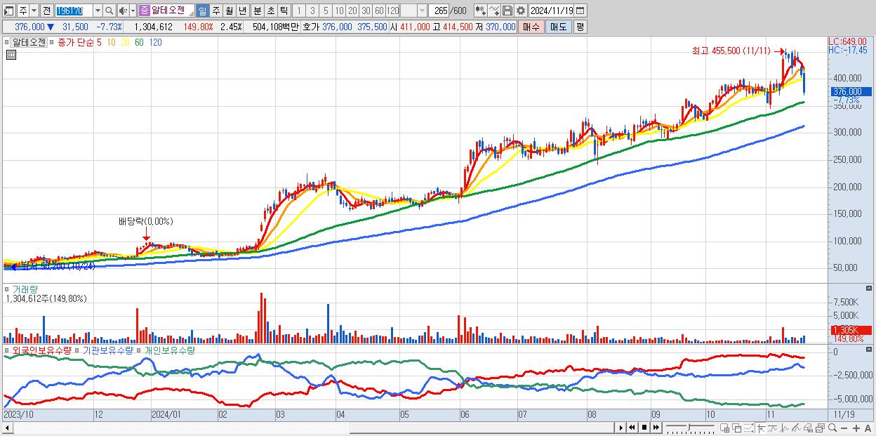 - 알테오젠 (376,000원 ▼ -7.73% , 시총: 200,479억, 외국인 순매수 거래금:84억)