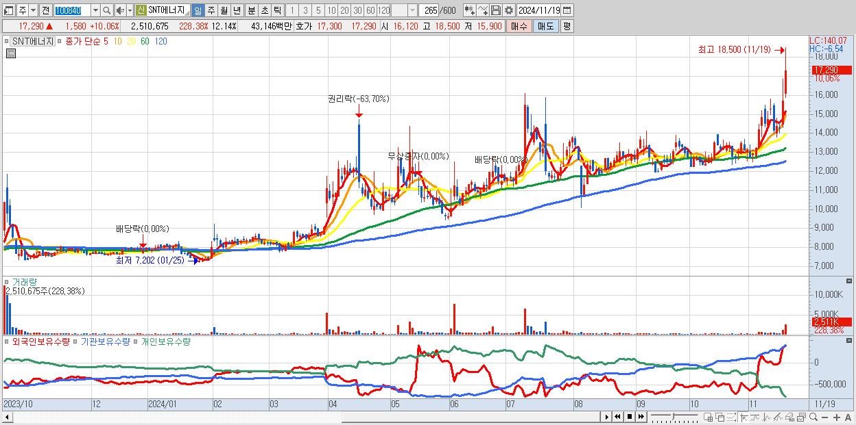 - SNT에너지 (17,290원 ▲ 10.06% , 시총: 3,576억, 거래량: 2,510,675, 거래대금:431억, KOSPI)