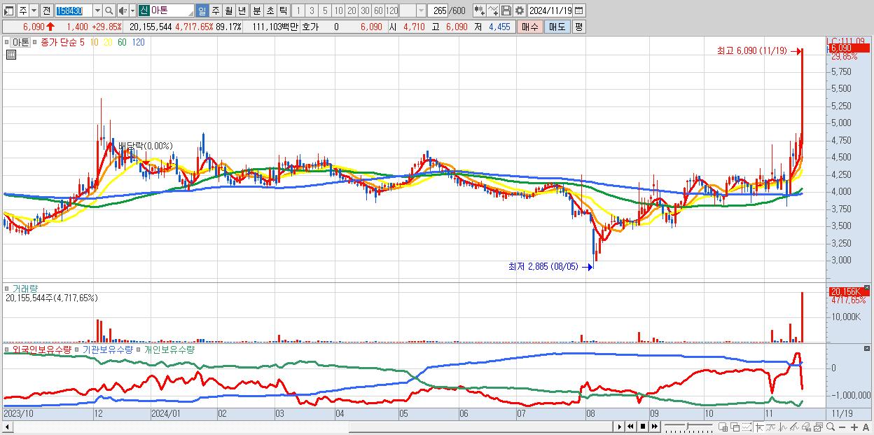 아톤 6,090원 ▲ 29.85% (KOSDAQ, 158430)