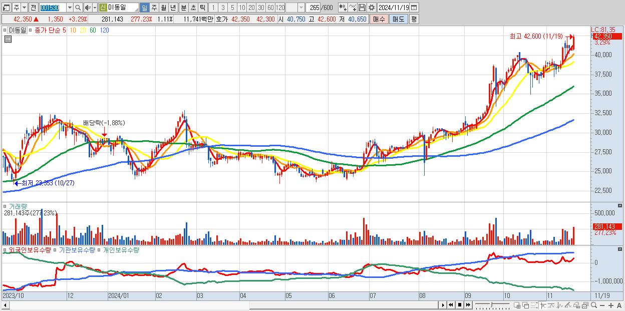 - DI동일 (42,350원 ▲ 3.29% , 시총: 10,679억, 거래량: 281,143, 거래대금:117억, KOSPI)