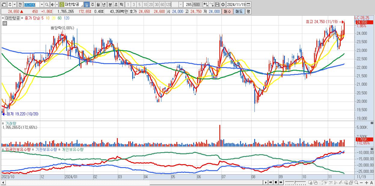 - 대한항공 (24,650원 ▲ 1.86% , 시총: 90,766억, 거래량: 1,765,265, 거래대금:434억, KOSPI)