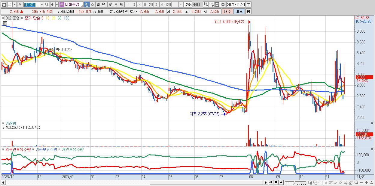 - 이화공영 (2,950원 ▲ 15.46% , 시총: 584억, 거래량: 7,463,260, 거래대금:219억)