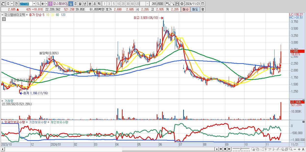 - 강스템바이오텍 (2,685원 ▲ 18.81% , 시총: 1,505억, 거래량: 22,339,562, 거래대금:619억)