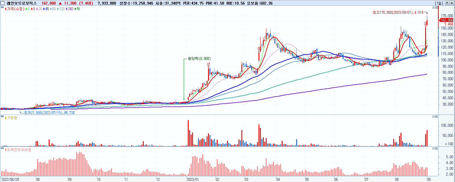 - 레인보우로보틱스 (162,800원 ▲ 7.46% , 시총: 31,341억, 거래량: 7,949,745, 거래대금:12,878억, KOSDAQ)