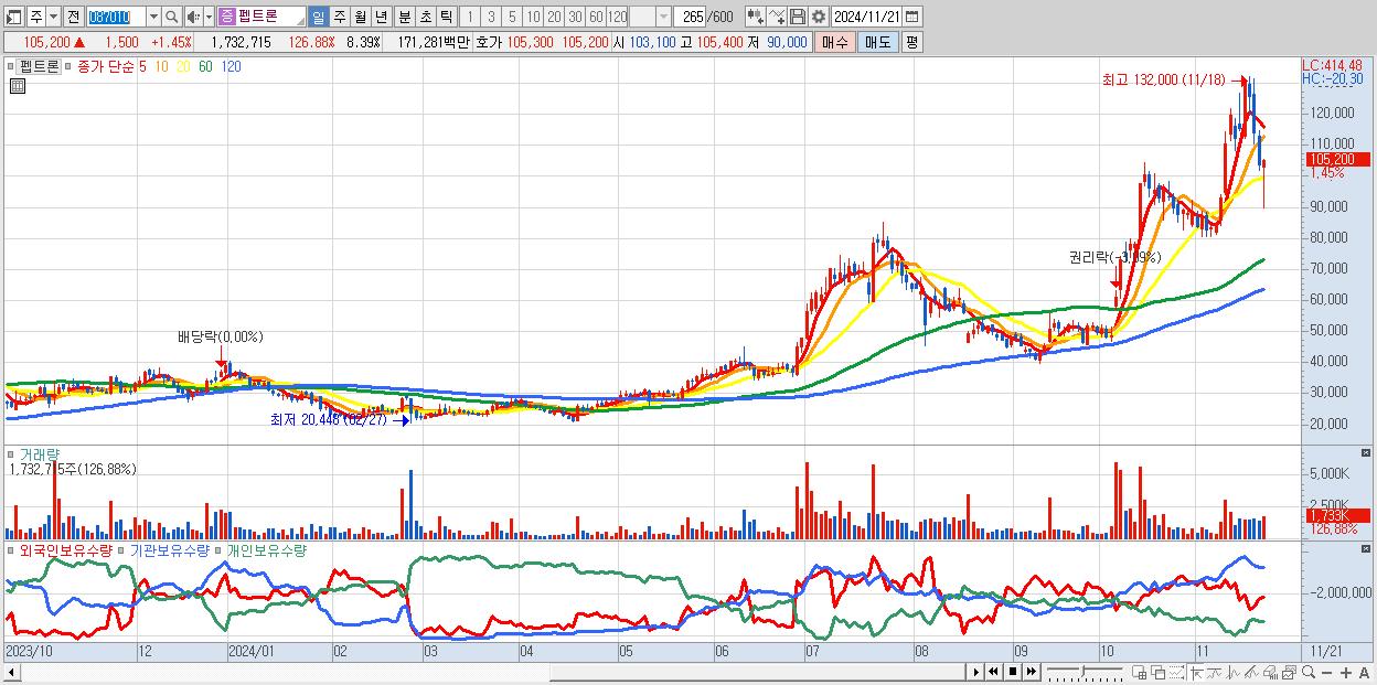 - 펩트론 (105,200원 ▲ 1.45% , 시총: 21,732억, 거래량: 1,732,715, 거래대금:1,713억)