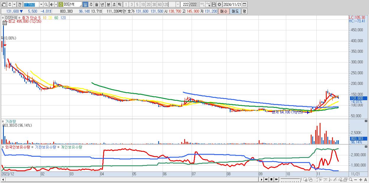 - DS단석 (131,600원 ▼ -4.01% , 시총: 7,714억, 거래량: 803,383, 거래대금:1,113억)