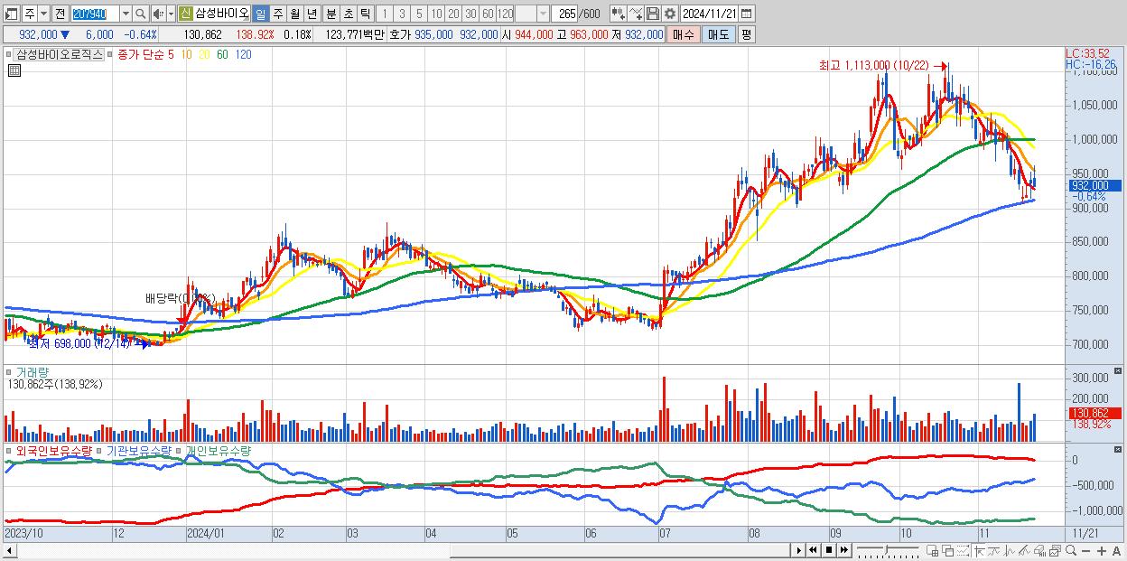 - 삼성바이오로직스 (932,000원 ▼ -0.64% , 시총: 663,342억, 거래량: 130,862, 거래대금:1,238억)