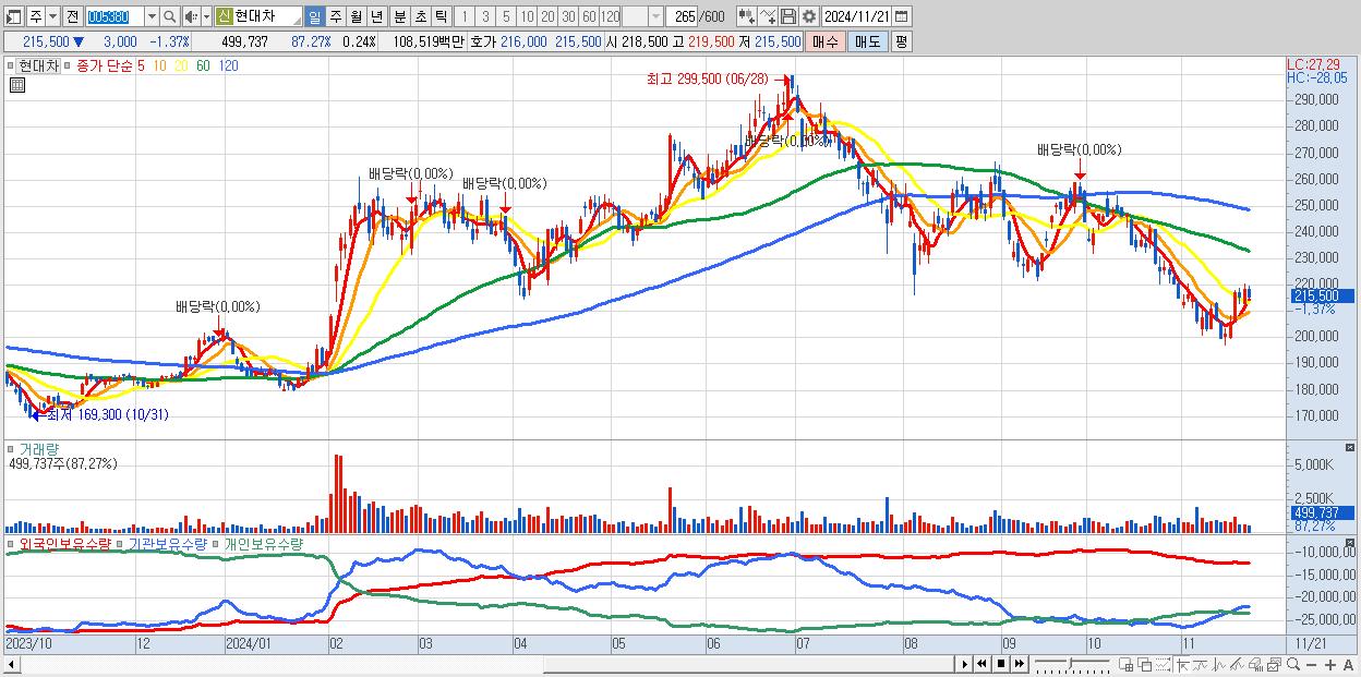 - 현대차 (215,500원 ▼ -1.37% , 시총: 451,292억, 거래량: 499,737, 거래대금:1,085억)