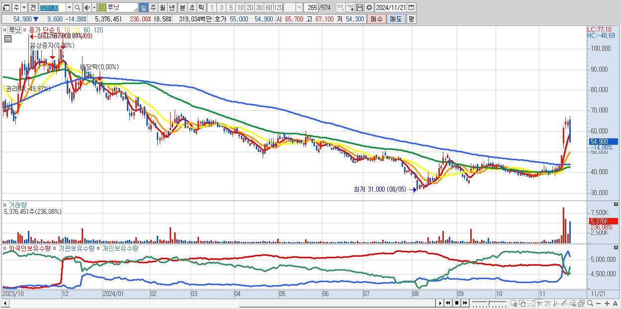 - 루닛 (54,900원 ▼ -14.88% , 시총: 15,890억, 거래량: 5,376,451, 거래대금:3,190억)