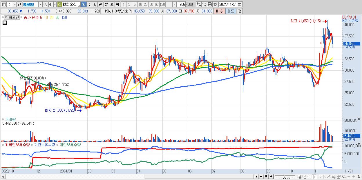 - 한화오션 (35,850원 ▼ -4.53% , 시총: 109,849억, 거래량: 5,442,320, 거래대금:1,961억)