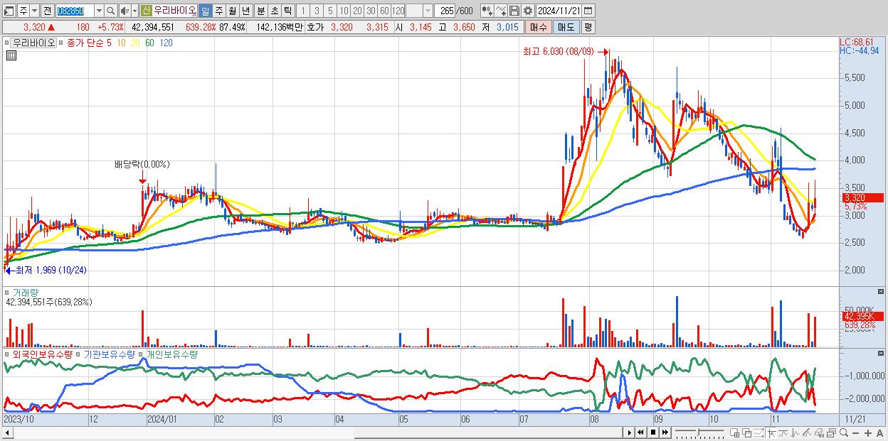 - 우리바이오 (3,320원 ▲ 5.73% , 시총: 1,609억, 거래량: 42,394,551, 거래대금:1,421억)