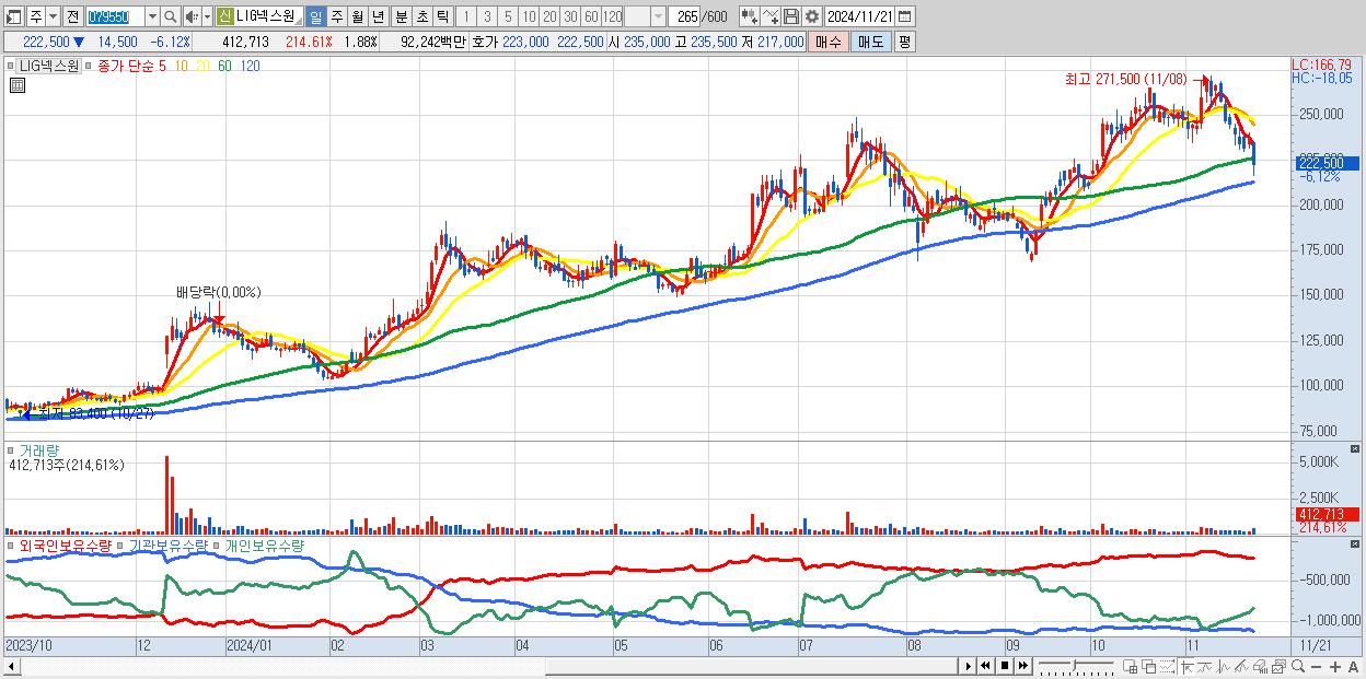 - LIG넥스원 (222,500원 ▼ -6.12% , 시총: 48,950억, 거래량: 412,713, 거래대금:922억)
