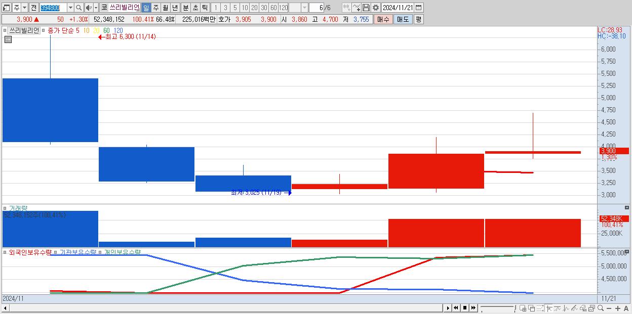 - 쓰리빌리언 (3,900원 ▲ 1.3% , 시총: 1,226억, 거래량: 52,348,152, 거래대금:2,250억)