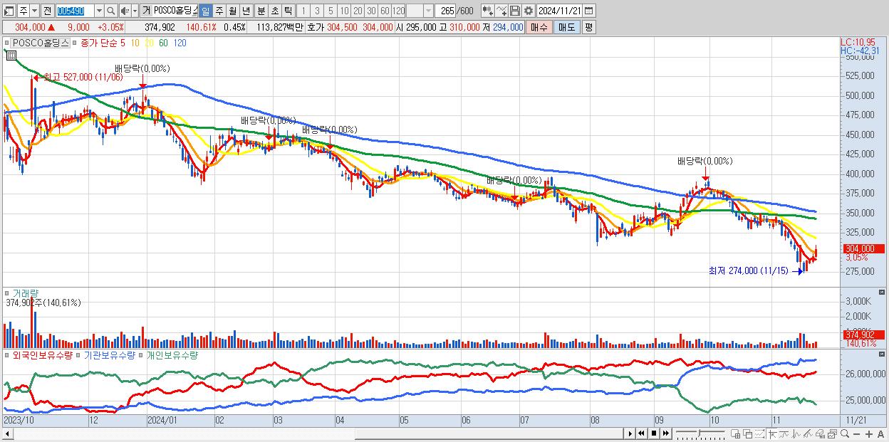 - POSCO홀딩스 (304,000원 ▲ 3.05% , 시총: 251,178억, 거래량: 374,902, 거래대금:1,138억)
