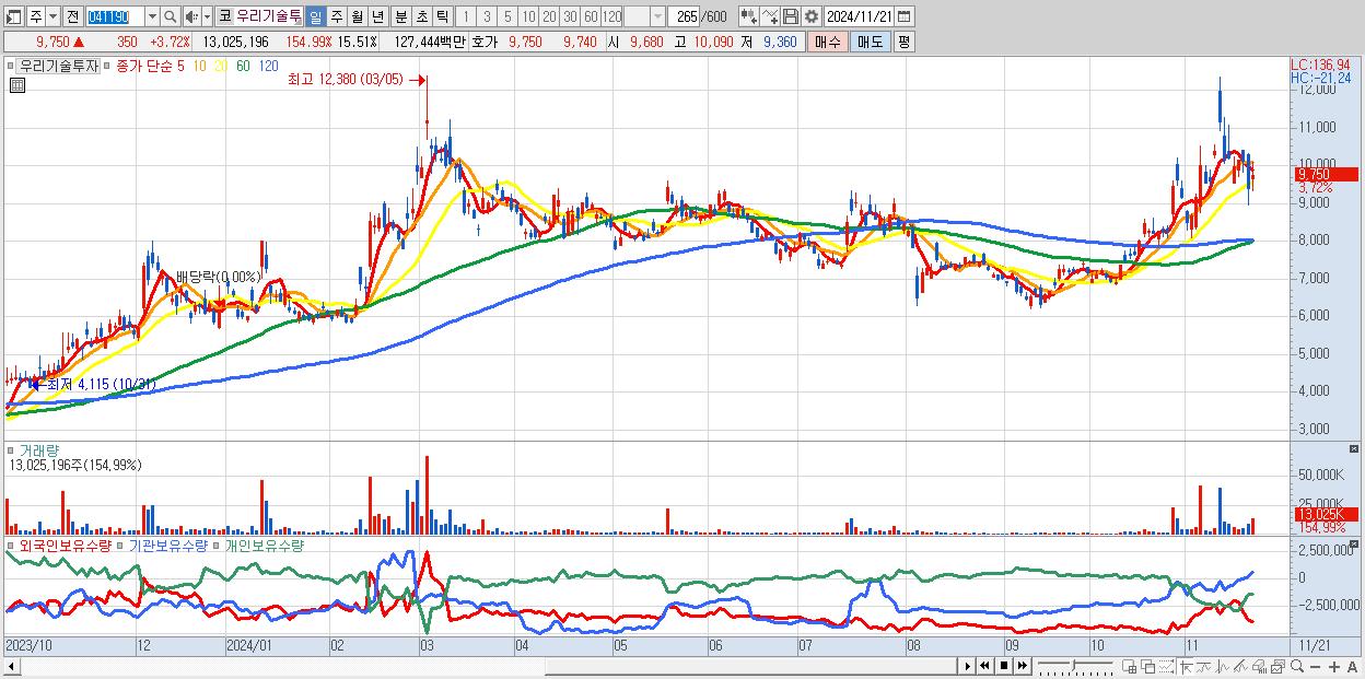 - 우리기술투자 (9,750원 ▲ 3.72% , 시총: 8,190억, 거래량: 13,025,196, 거래대금:1,274억)