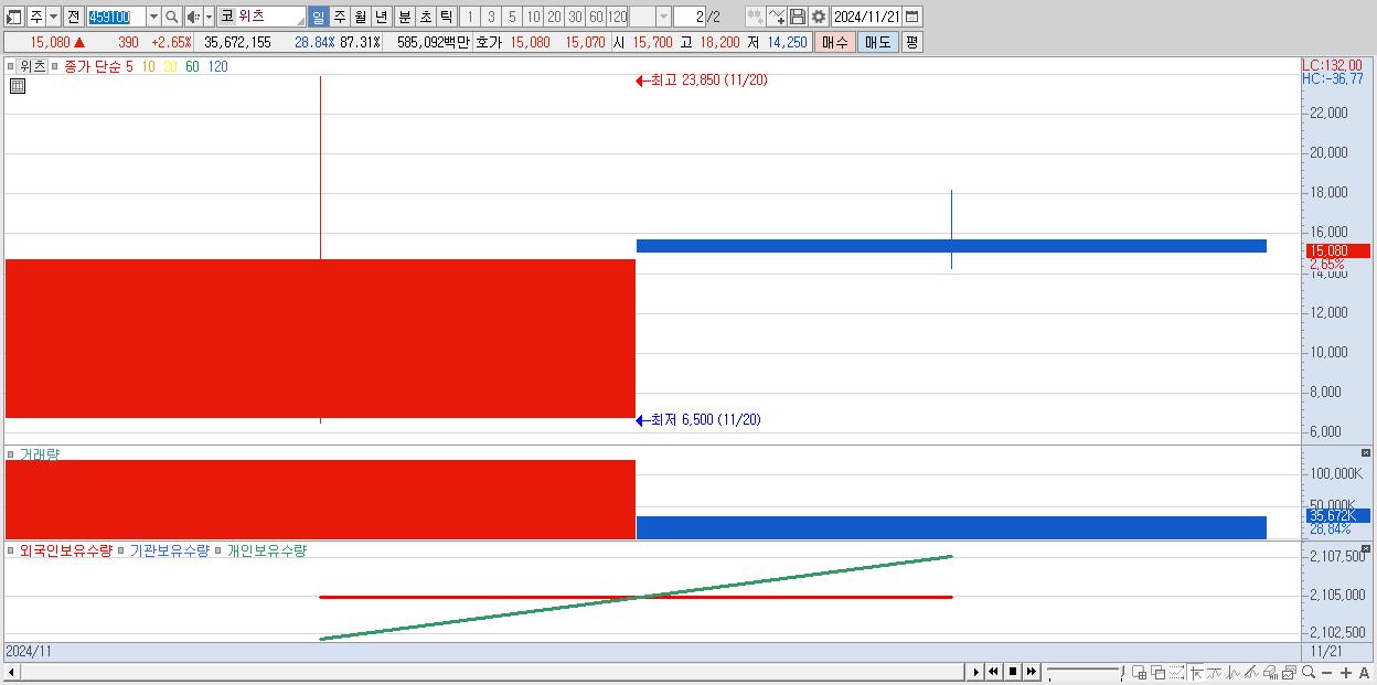 - 위츠 (15,080원 ▲ 2.65% , 시총: 1,872억, 거래량: 35,672,155, 거래대금:5,851억)