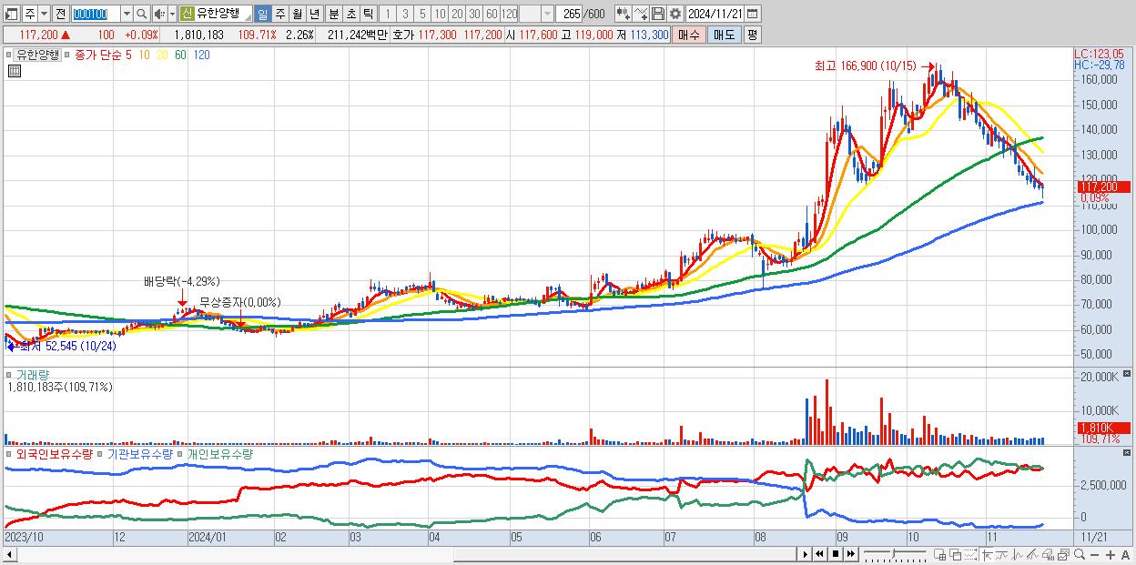- 유한양행 (117,200원 ▲ 0.09% , 시총: 94,005억, 거래량: 1,810,183, 거래대금:2,112억)