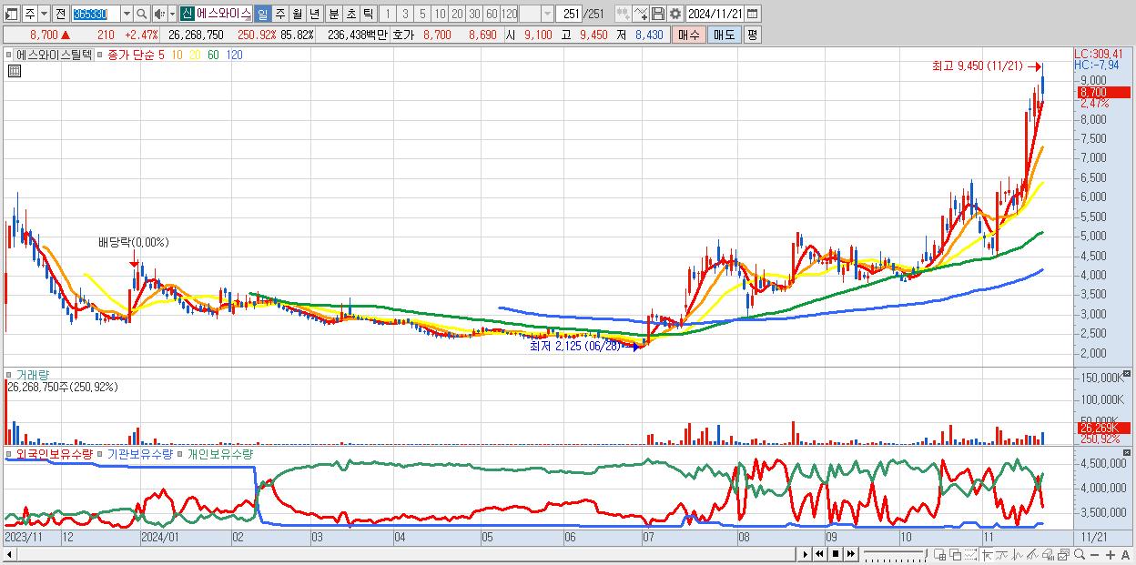 - 에스와이스틸텍 (8,700원 ▲ 2.47% , 시총: 2,663억, 거래량: 26,268,750, 거래대금:2,364억)