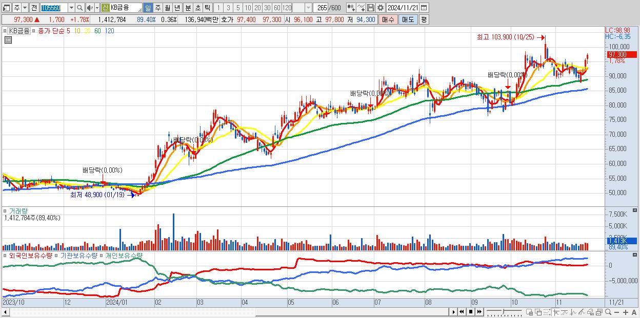 - KB금융 (97,300원 ▲ 1.78% , 시총: 382,903억, 거래량: 1,412,784, 거래대금:1,369억)