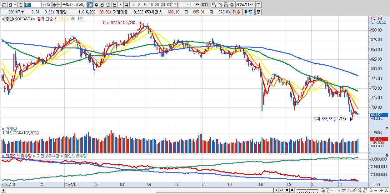 | 11/21 | 680.67 | ▼-0.33% | 638억 | -770억 | 38억 | 94억 |