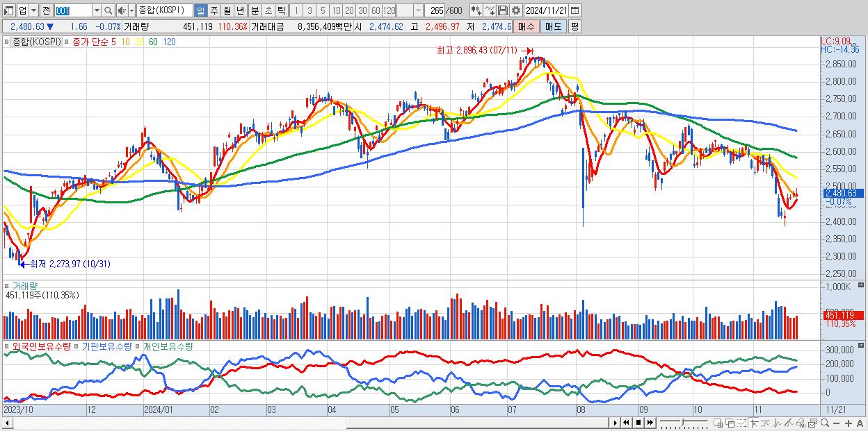 | 11/14 | 2,418.86 | ▲0.07% | -1,142억 | -2,321억 | 2,823억 | 640억 |