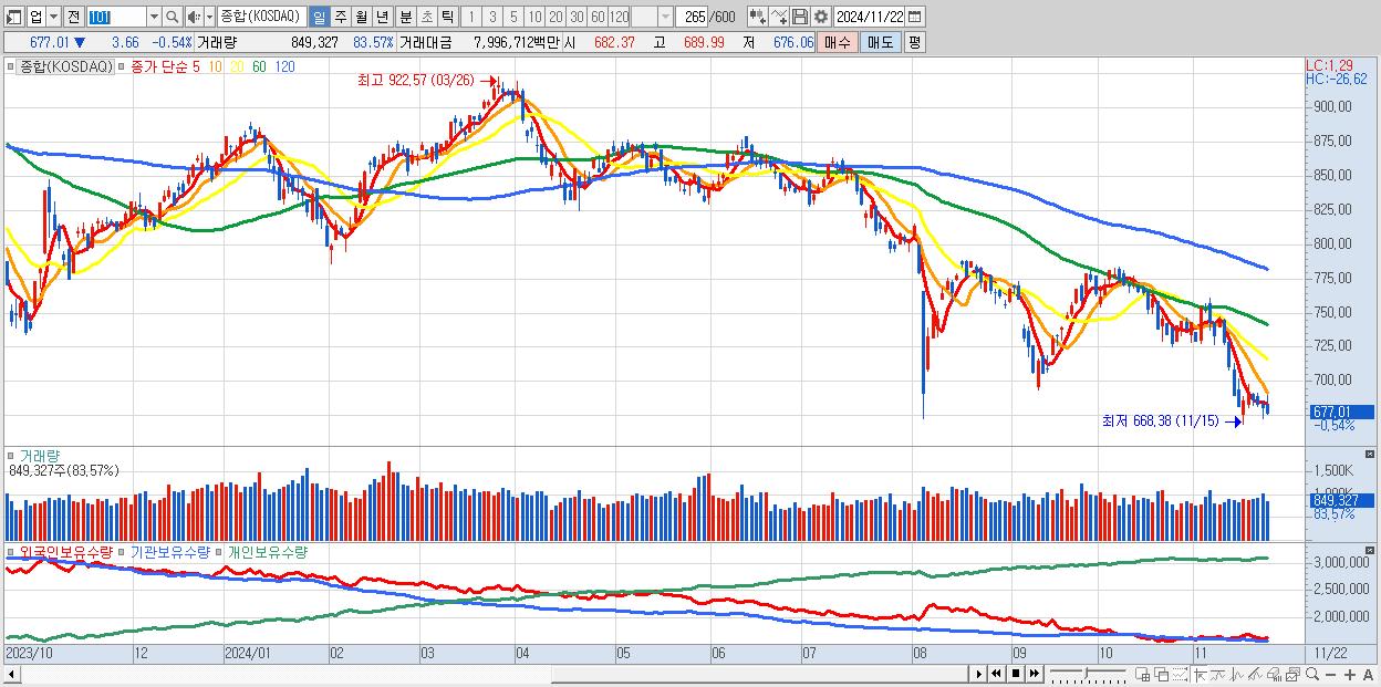 | 11/18 | 689.55 | ▲0.60% | 1,579억 | -303억 | -809억 | -468억 |