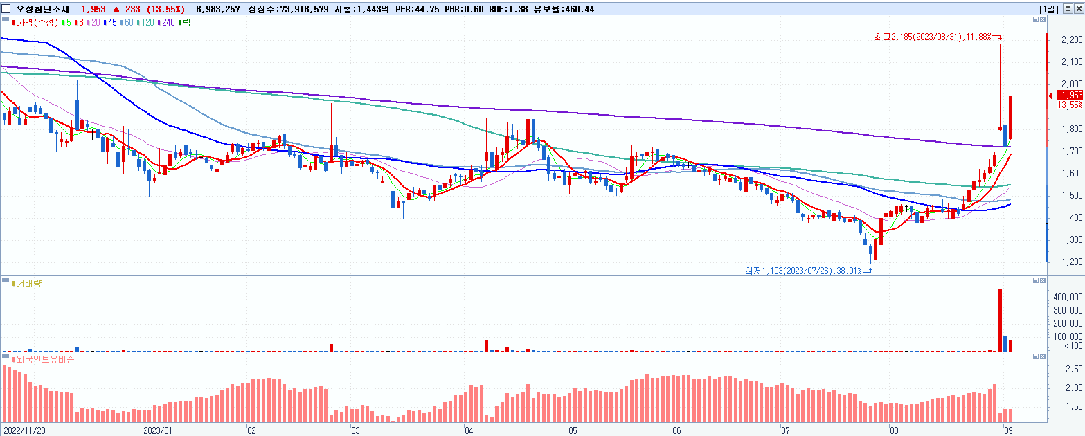 - 오성첨단소재 (1,953원 ▲ 13.55% , 시총: 1,444억, 거래량: 8,983,257, 거래대금:168억)