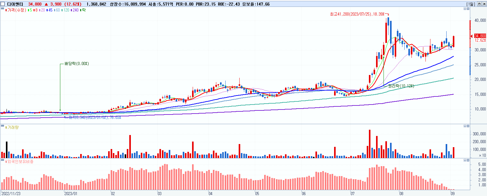 - 디이엔티 (34,800원 ▲ 12.62% , 시총: 5,571억, 거래량: 1,368,842, 거래대금:462억)
