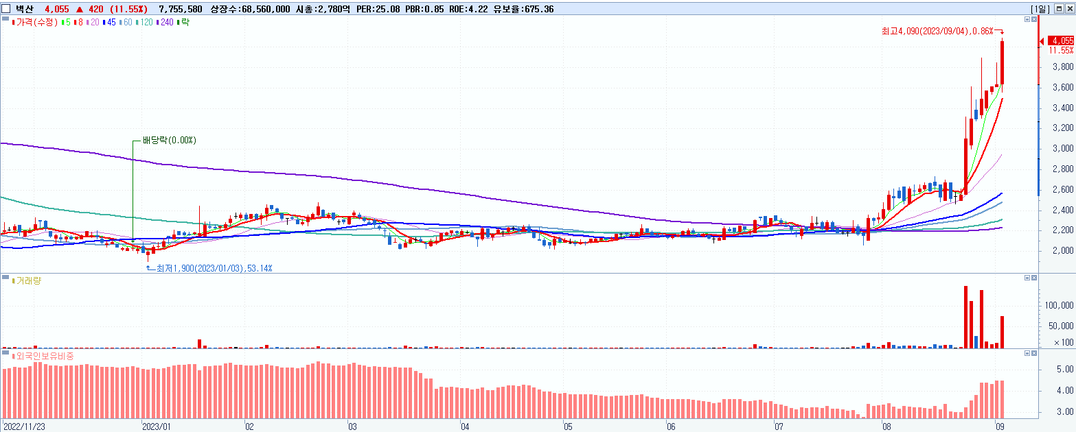 - 벽산 (4,055원 ▲ 11.55% , 시총: 2,780억, 거래량: 7,755,580, 거래대금:305억)