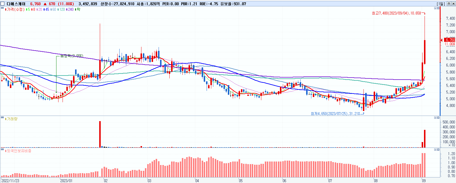 - 디에스케이 (6,760원 ▲ 11% , 시총: 1,827억, 거래량: 3,492,839, 거래대금:246억)