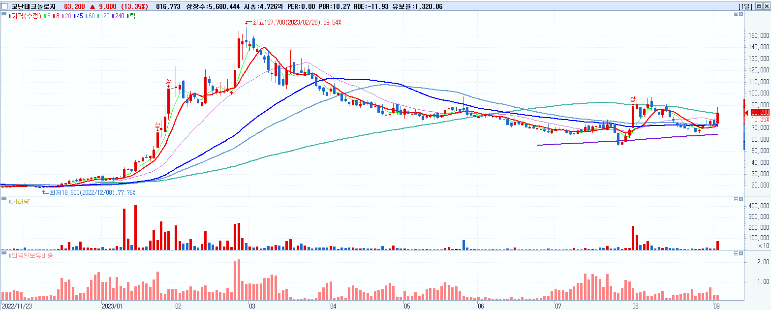 - 코난테크놀로지 (83,200원 ▲ 13.35% , 시총: 4,726억, 거래량: 816,773, 거래대금:680억)