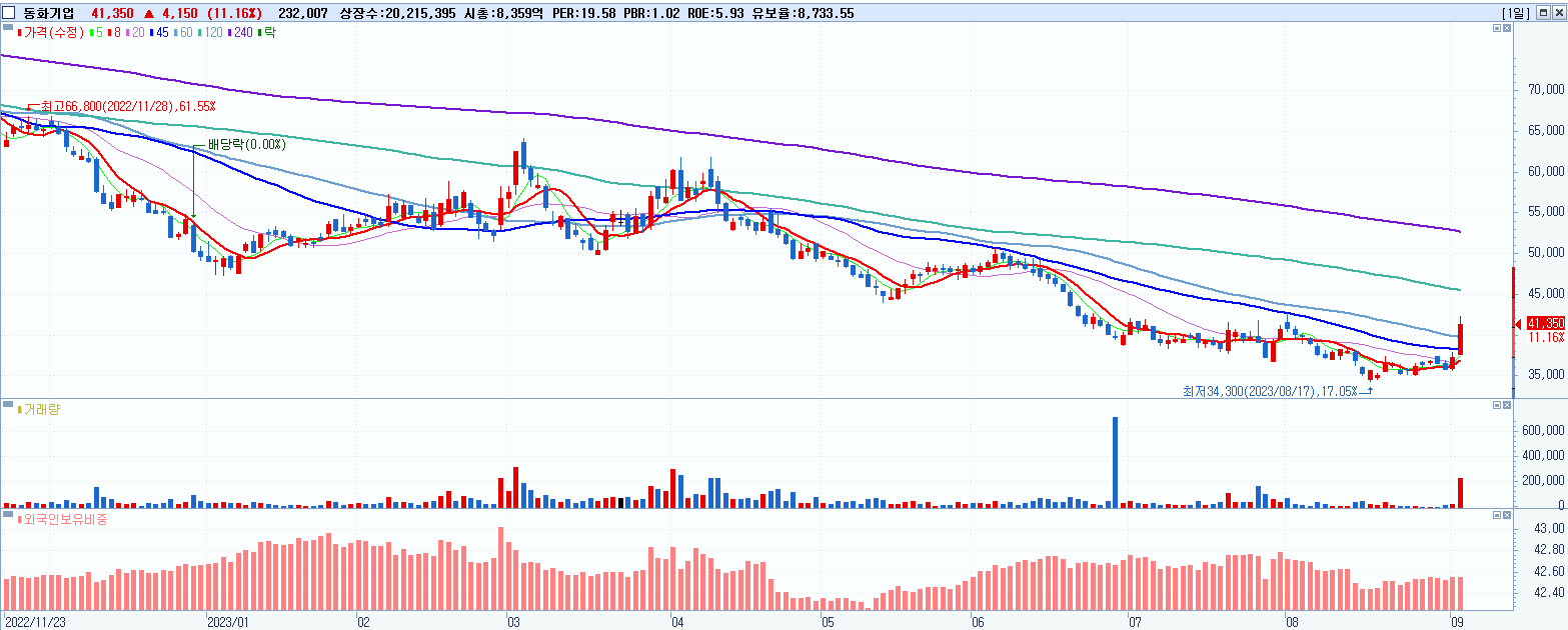 - 동화기업 (41,350원 ▲ 11.16% , 시총: 8,359억, 거래량: 232,007, 거래대금:94억)