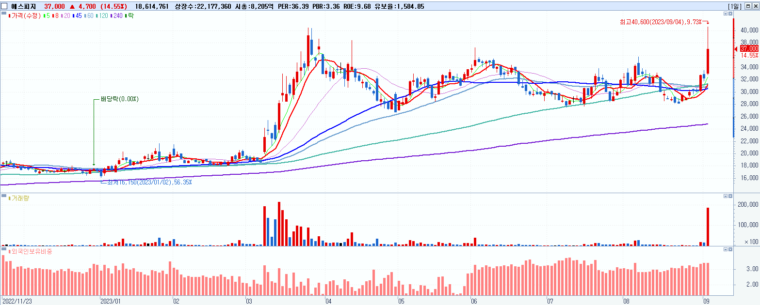 - 에스피지 (37,000원 ▲ 14.55% , 시총: 8,206억, 거래량: 18,614,761, 거래대금:6,929억)