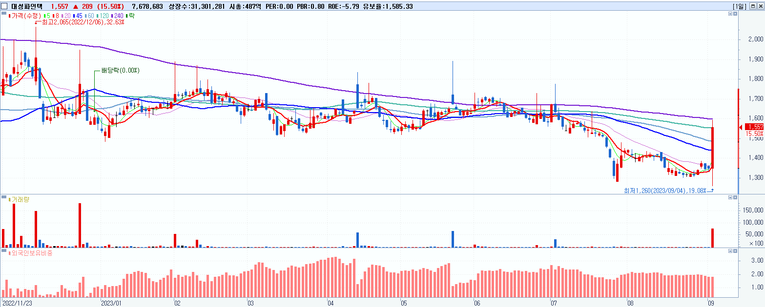 - 대성파인텍 (1,557원 ▲ 15.5% , 시총: 487억, 거래량: 7,678,683, 거래대금:117억)