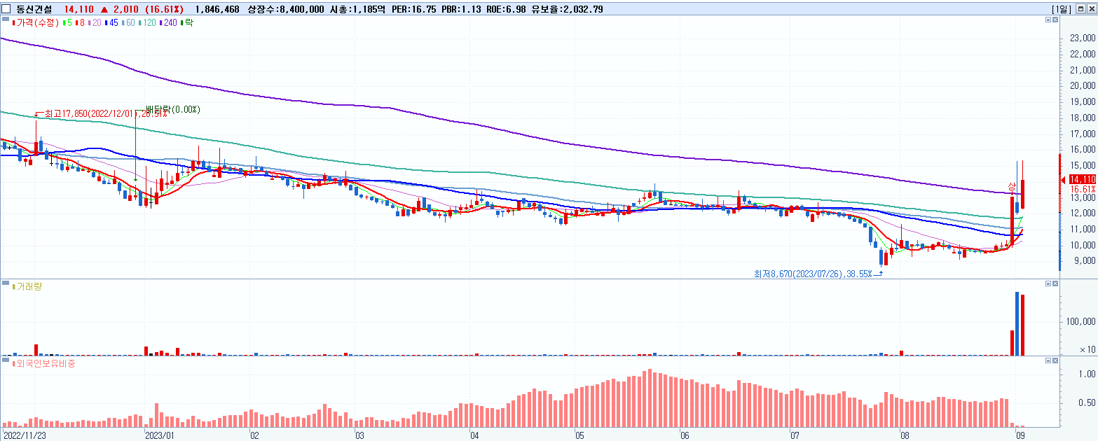 - 동신건설 (14,110원 ▲ 16.61% , 시총: 1,185억, 거래량: 1,846,468, 거래대금:260억)