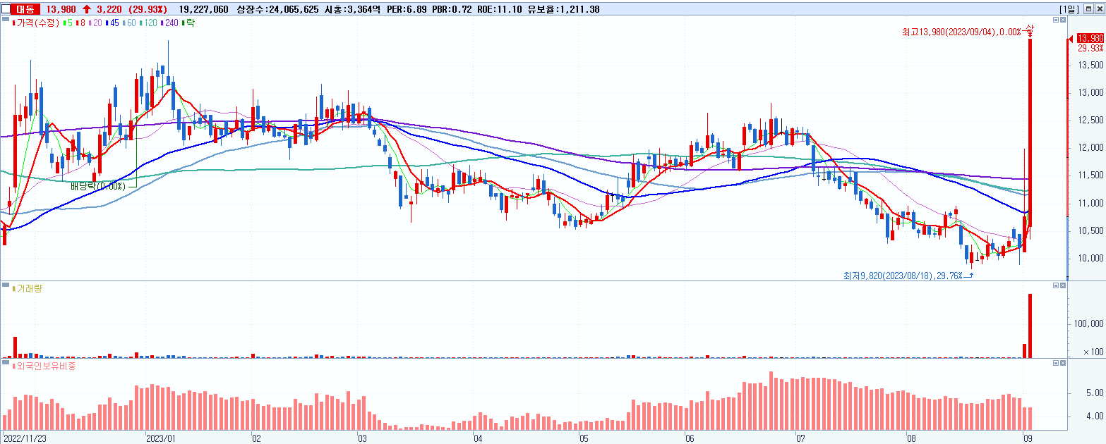 2.대동 13,980원 ▲ 29.93% (KOSPI, 000490)