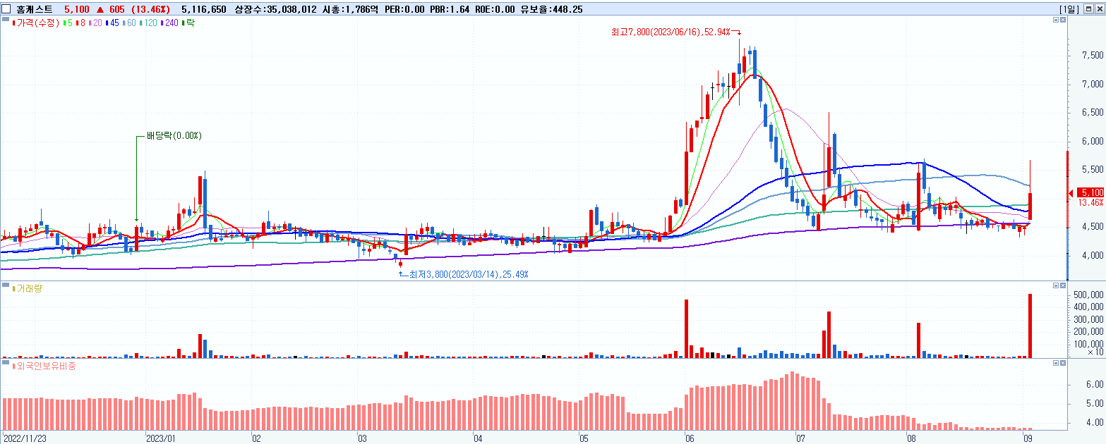 - 홈캐스트 (5,100원 ▲ 13.46% , 시총: 1,787억, 거래량: 5,116,650, 거래대금:274억)